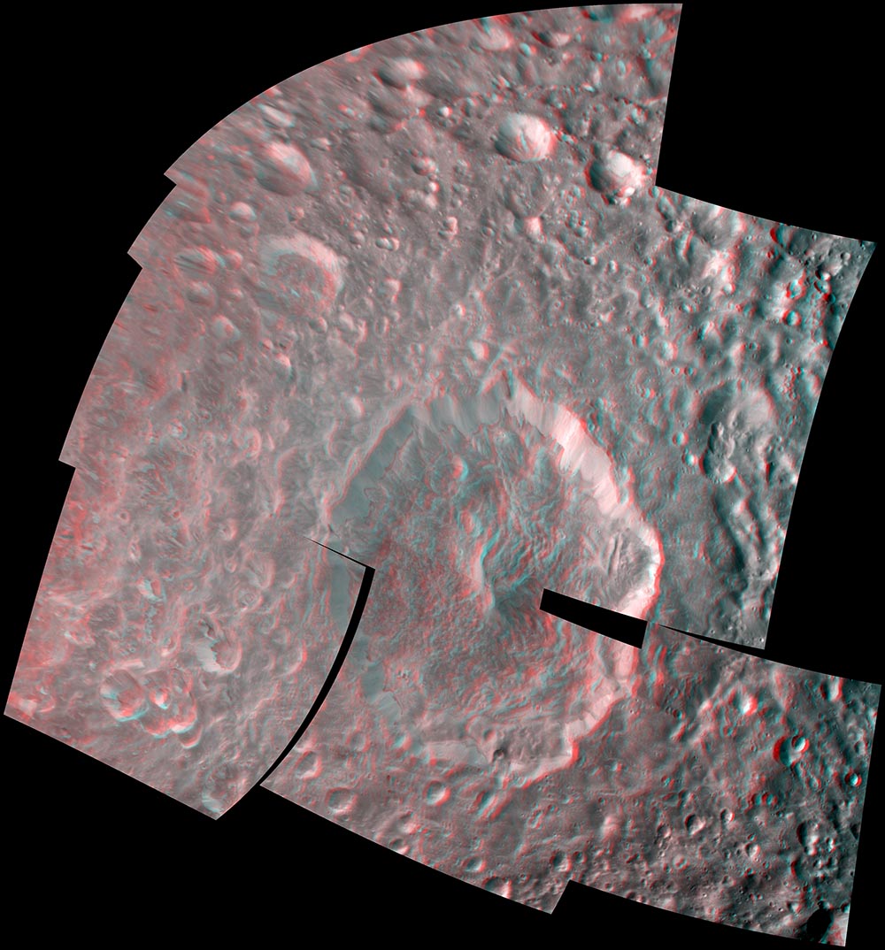 NASA's Cassini spacecraft captured a three-dimensional view of the large Herschel Crater on Saturn's moon Mimas during its closest-ever flyby of the moon. Herschel Crater is 130 kilometers (80 miles) wide and covers most of the bottom center of this image. Scientists continue to study this impact basin and its surrounding terrain (see PIA12569 and PIA12571). This 3-D view is a color composite mosaic made from 14 different black and white images that were taken from slightly different viewing angles. The images were re-projected to a simple cylindrical projection. The images were combined so that the viewer's left and right eye, respectively and separately, see a left and right image of the black and white stereo pair when viewed through red-blue glasses. This view is centered on terrain at 11 degrees north latitude, 122 degrees west longitude. This view looks toward the hemisphere of Mimas that leads in its orbit around Saturn. Mimas is 396 kilometers (246 miles) across. North on Mimas is up. The images were taken in visible light with Cassini's spacecraft narrow-angle camera on Feb. 13, 2010. The view was acquired at a distance of approximately 21,000 kilometers (13,000 miles) from Mimas. Image scale is 92 meters (302 feet) per pixel. |
