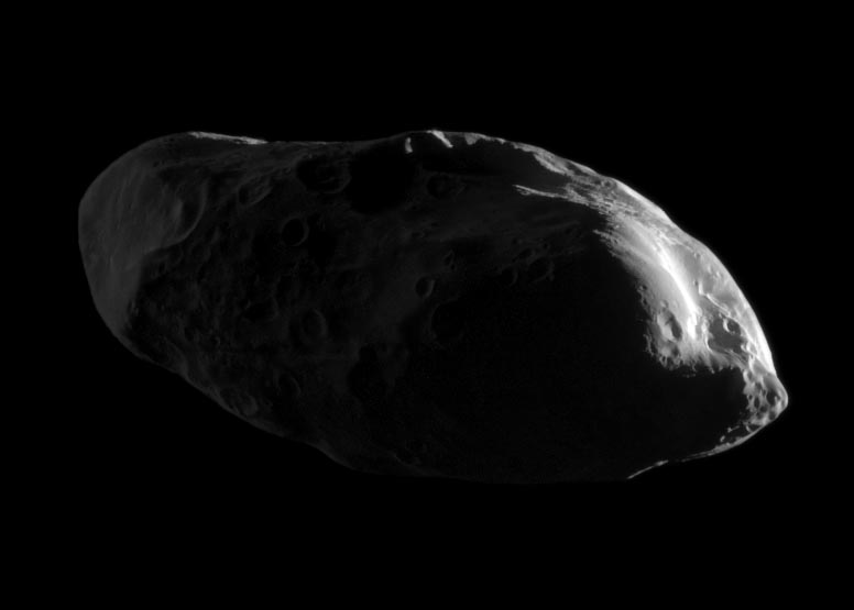Appearing like eyes on a potato, craters cover the dimly lit surface of the moon Prometheus in this high-resolution image from the Cassini spacecraft's early 2010 flyby. The Jan. 27 encounter represented the closest imaging sequence yet of that moon for Cassini. This view looks toward the trailing hemisphere of Prometheus (86 kilometers, or 53 miles across). North on Prometheus is up and rotated 8 degrees to the right. The moon is lit by sunlight on the right and Saturnshine on the left. The image was taken in visible light with the Cassini spacecraft narrow-angle camera on Jan. 27, 2010. The view was obtained at a distance of approximately 34,000 kilometers (21,000 miles) from Prometheus and at a Sun-Prometheus-spacecraft, or phase, angle of 126 degrees. Image scale is 200 meters (656 feet) per pixel. |