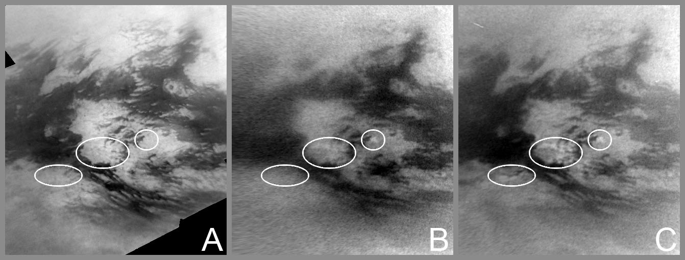 Annotation Image Click on the image for larger version Images from NASA's Cassini spacecraft show changes caused by methane rain in the bright Adiri region near the equator of Saturn's largest moon, Titan. Although no clouds are present in these images, the changes wrought by recent methane rainstorms are visible. These images show areas of brightened terrain within the already bright region known as Adiri. Adiri's terrain appears near the center of these frames. The dark, low-lying dune field known as Belet extends west from the left of these frames. Terrain south of Belet was soaked by methane rains in late 2010 (see PIA12817 and PIA12818). (Adiri and Belet have different brightnesses because they have different compositions.) The first image, panel A on the left, was taken on May 13, 2007, and shows what this area looked like earlier in the Cassini mission. Panels B and C were both captured on Jan. 15, 2011, 15 hours apart. New bright areas (within the white outlines of panels B and C) are thought to be on or near the surface of the moon. These bright objects are not high altitude clouds because they do not drift during the 15 hours between when panel B and panel C were taken. Scientists are still analyzing the findings, but these brightened spots could be low-lying fog or clouds in areas with higher amounts of moisture on the surface. They could also possibly be terrain that has been washed clean by methane rains. (The bright spots did not become brighter in the 15 hours between panels B and C. They appear brighter only because of a change in viewing geometry.) Titan's weather has been changing with the seasons, and storms now are more common at low latitudes such as those observed here. See PIA11667 to learn how the sun's illumination of the Saturnian system changed during the transition to spring in the northern hemispheres and to fall in the southern hemispheres of the planet and its moons. See PIA12813 to learn more about Titan's changing weather. These images were re-projected, and the view in each is centered on terrain at 7 degrees south latitude, 215 degrees west longitude. These images were taken with the Cassini spacecraft narrow-angle camera using a spectral filter sensitive to wavelengths of near-infrared light centered at 938 nanometers. The views were obtained at a range of distances from approximately 150,000 kilometers (93,000 miles) to 997,000 kilometers (620,000 miles) from Titan. Scale is about 7 kilometers (4 miles) per pixel in these re-projected images. |