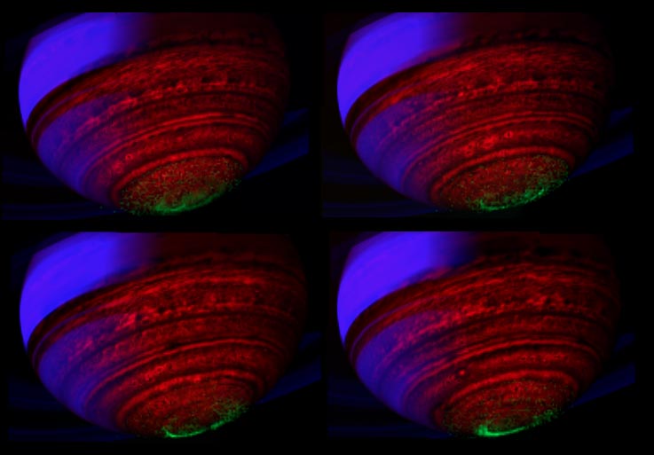 A quartet of false-color, composite images show the dance of Saturn's southern lights in data obtained by NASA's Cassini spacecraft. This image is among the first images to be released from a study that extracts auroral emissions out of the entire catalogue of images taken by Cassini's visual and infrared mapping spectrometer. In this image constructed from data collected in the near-infrared wavelengths of light, the auroral emission is shown in green. The data represents emissions from hydrogen ions in of light between 3 and 4 microns in wavelength. In general, scientists designated blue to indicate sunlight reflected at a wavelength of 2 microns, green to indicate sunlight reflected at 3 microns and red to indicate thermal emission at 5 microns. Saturn's rings reflect sunlight at 2 microns, but not at 3 and 5 microns, so they appear deep blue. Saturn's high altitude haze reflects sunlight at both 2 and 3 microns, but not at 5 microns, and so it appears green to blue-green. The heat emission from the interior of Saturn is only seen at 5 microns wavelength in the spectrometer data, and thus appears red. The dark spots and banded features in the image are clouds and small storms that outline the deeper weather systems and circulation patterns of the planet. They are illuminated from underneath by Saturn's thermal emission, and thus appear in silhouette. The images that make up the composite were obtained on May 24, 2007. |
