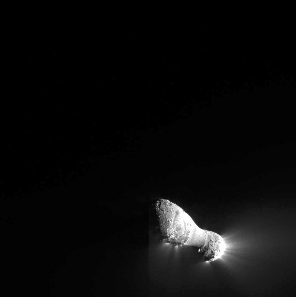 Comet Hartley 2 can be seen in glorious detail in this image from NASA's EPOXI mission. It was taken as the spacecraft flew by around 6:59 a.m. PDT (9:59 a.m. EDT), from a distance of about 700 kilometers (435 miles). The comet's nucleus, or main body, is approximately 2 kilometers (1.2 miles) long and .4 kilometers (.25 miles) at the "neck," or most narrow portion. Jets can be seen streaming out of the nucleus. The mission's Medium-Resolution Instrument was used to capture this view. |