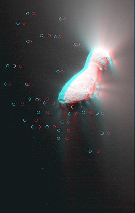 This 3-D image shows the entire nucleus of Hartley 2 with jets and an icy particle cloud. Circles have been added to highlight the location of individual particles. The images used to make this 3-D image, known as an anaglyph, were obtained by the Medium-Resolution Imager on Nov. 4, 2010, the day the EPOXI mission spacecraft made its closest approach to the comet. This 3-D image should be seen with blue-red glasses, where the red lens is in front of the left eye. |