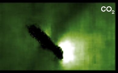 Infrared scans of comet Hartley 2 by NASA's EPOXI mission spacecraft show carbon dioxide, dust, and ice being distributed in a similar way and emanating from apparently the same locations on the nucleus. Water vapor, however, has a different distribution implying a different source region and process. These maps were made from data obtained by the High-Resolution Imager on Nov. 4, 2010. |