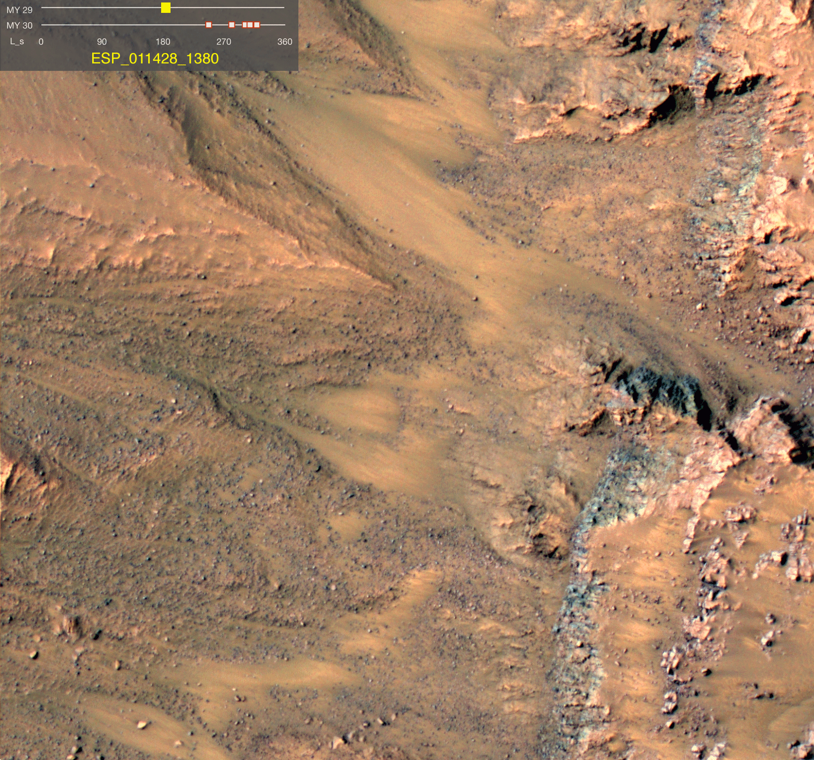 Click on the image for the movie This series of images shows warm-season features that might be evidence of salty liquid water active on Mars today. Evidence for that possible interpretation is presented in a report by McEwen et al. in the Aug. 5, 2011, edition of Science. These images come from observations of Newton crater, at 41.6 degrees south latitude, 202.3 degrees east longitude, by the High Resolution Imaging Science Experiment (HiRISE) camera on NASA's Mars Reconnaissance Orbiter. In time, the series spans from early spring of one Mars year to mid-summer of the following year. The images taken from oblique angles have been adjusted so that all steps in the sequence show the scene as if viewed from directly overhead. The features that extend down the slope during warm seasons are called recurring slope lineae. They are narrow (one-half to five yards or meters wide), relatively dark markings on steep (25 to 40 degree) slopes at several southern hemisphere locations. Repeat imaging by HiRISE shows the features appear and incrementally grow during warm seasons and fade in cold seasons. They extend downslope from bedrock outcrops, often associated with small channels, and hundreds of them form in rare locations. They appear and lengthen in the southern spring and summer from 48 degrees to 32 degrees south latitudes favoring equator-facing slopes. These times and places have peak surface temperatures from about 10 degrees below zero Fahrenheit to 80 degree above zero Fahrenheit (about 250 to 300 Kelvin). Liquid brines near the surface might explain this activity, but the exact mechanism and source of the water are not understood. The series is timed to dwell two seconds on the first and last frames and one second on intermediate frames, though network or computer performance may cause this to vary. The legend on each image gives the exact HiRISE observation number so that additional image products from the observation and information about the observation can be found on the HiRISE website (e.g., the first image of the series is from ESP_011428_1380, at http://hirise.lpl.arizona.edu/ESP_011428_1380). The legend also marks the Mars year and seasonal identifier (Ls) for each image. The Mars years begin with the first years of Mars exploration by robot spacecraft. This sequence includes images from Mars Year 29 and Mars Year 30. Ls stands for longitude of the sun, dividing the year into 360 degrees to mark the seasons. Ls = 180 is the beginning of southern spring, Ls = 270 is the beginning of southern summer, and Ls = 360 (or 0) is the beginning of southern autumn. |
