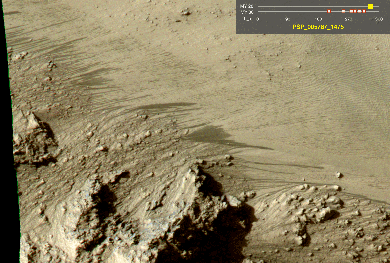 Click on the image for the movie This series of images shows warm-season features that might be evidence of salty liquid water active on Mars today. Evidence for that possible interpretation is presented in a report by McEwen et al. in the Aug. 5, 2011, edition of Science. These images come from observations of Horowitz crater, at 32 degrees south latitude, 141 degrees east longitude, by the High Resolution Imaging Science Experiment (HiRISE) camera on NASA's Mars Reconnaissance Orbiter. In time, the series spans from late summer of one Mars year to mid-summer of two years later. The images taken from oblique angles have been adjusted so that all steps in the sequence show the scene as if viewed from directly overhead. The features that extend down the slope during warm seasons are called recurring slope lineae. They are narrow (one-half to five yards or meters wide), relatively dark markings on steep (25 to 40 degree) slopes at several southern hemisphere locations. Repeat imaging by HiRISE shows the features appear and incrementally grow during warm seasons and fade in cold seasons. They extend downslope from bedrock outcrops, often associated with small channels, and hundreds of them form in rare locations. They appear and lengthen in the southern spring and summer from 48 degrees to 32 degrees south latitudes favoring equator-facing slopes. These times and places have peak surface temperatures from about 10 degrees below zero Fahrenheit to 80 degree above zero Fahrenheit (about 250 to 300 Kelvin). Liquid brines near the surface might explain this activity, but the exact mechanism and source of the water are not understood. The series is timed to dwell two seconds on the first and last frames and one second on intermediate frames, though network or computer performance may cause this to vary. The legend on each image gives the exact HiRISE observation number so that additional image products from the observation and information about the observation can be found on the HiRISE website (e.g., the first image of the series is from PSP_005787_1475, at http://hirise.lpl.arizona.edu/PSP_005787_1475). The legend also marks the Mars year and seasonal identifier (Ls) for each image. The Mars years begin with the first years of Mars exploration by robot spacecraft. This sequence includes images from Mars Year 28 and Mars Year 30. Ls stands for longitude of the sun, dividing the year into 360 degrees to mark the seasons. Ls = 180 is the beginning of southern spring, Ls = 270 is the beginning of southern summer, and Ls = 360 (or 0) is the beginning of southern autumn. |