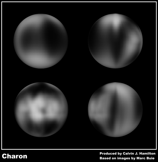 This image shows four views of Pluto's moon Charon. The images are centered in 0 degrees latitude, and 0 (top-left), 90 (top-right), 180 (bottom-left), and 270 (bottom-right) degrees longitude. The images are based on photometric measurements of Marc Buie/Lowell Observatory. |