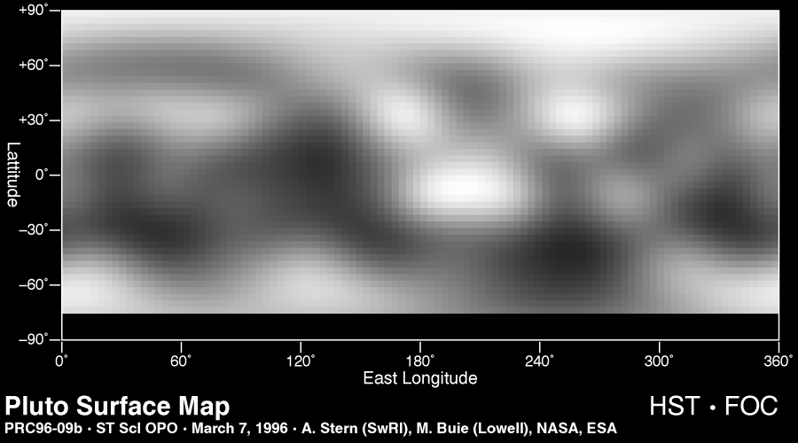 This is the first image-based surface map of the solar system's most remote planet, Pluto. This map was assembled by computer image processing software from four separate images of Pluto's disk taken with the European Space Agency's (ESA) Faint Object Camera (FOC) aboard NASA's Hubble Space Telescope. Hubble imaged nearly the entire surface, as Pluto rotated on its axis in late June and early July 1994. The map, which covers 85% of the planet's surface, confirms that Pluto has a dark equatorial belt and bright polar caps, as inferred from ground-based light curves obtained during the mutual eclipses that occurred between Pluto and its satellite Charon in the late 1980s. The brightness variations in this map may be due to topographic features such as basins and fresh impact craters. However, most of the surface features unveiled by Hubble are likely produced by the complex distribution of frosts that migrate across Pluto's surface with its orbital and seasonal cycles. Names may later be proposed for some of the larger regions. Image reconstruction techniques smooth out the coarse pixels in the four raw images to reveal major regions where the surface is either bright or dark. The black strip across the bottom corresponds to the region surrounding Pluto's south pole, which was pointed away from Earth when the observations were made, and could not be imaged. Pluto itself probably shows even more contrast and perhaps sharper boundaries between light and dark areas than is shown here, but Hubble's resolution (just like early telescopic views of Mars) tends to blur edges and blend together small features sitting inside larger ones. Credit: Alan Stern (Southwest Research Institute), Marc Buie (Lowell Observatory), NASA and ESA. |