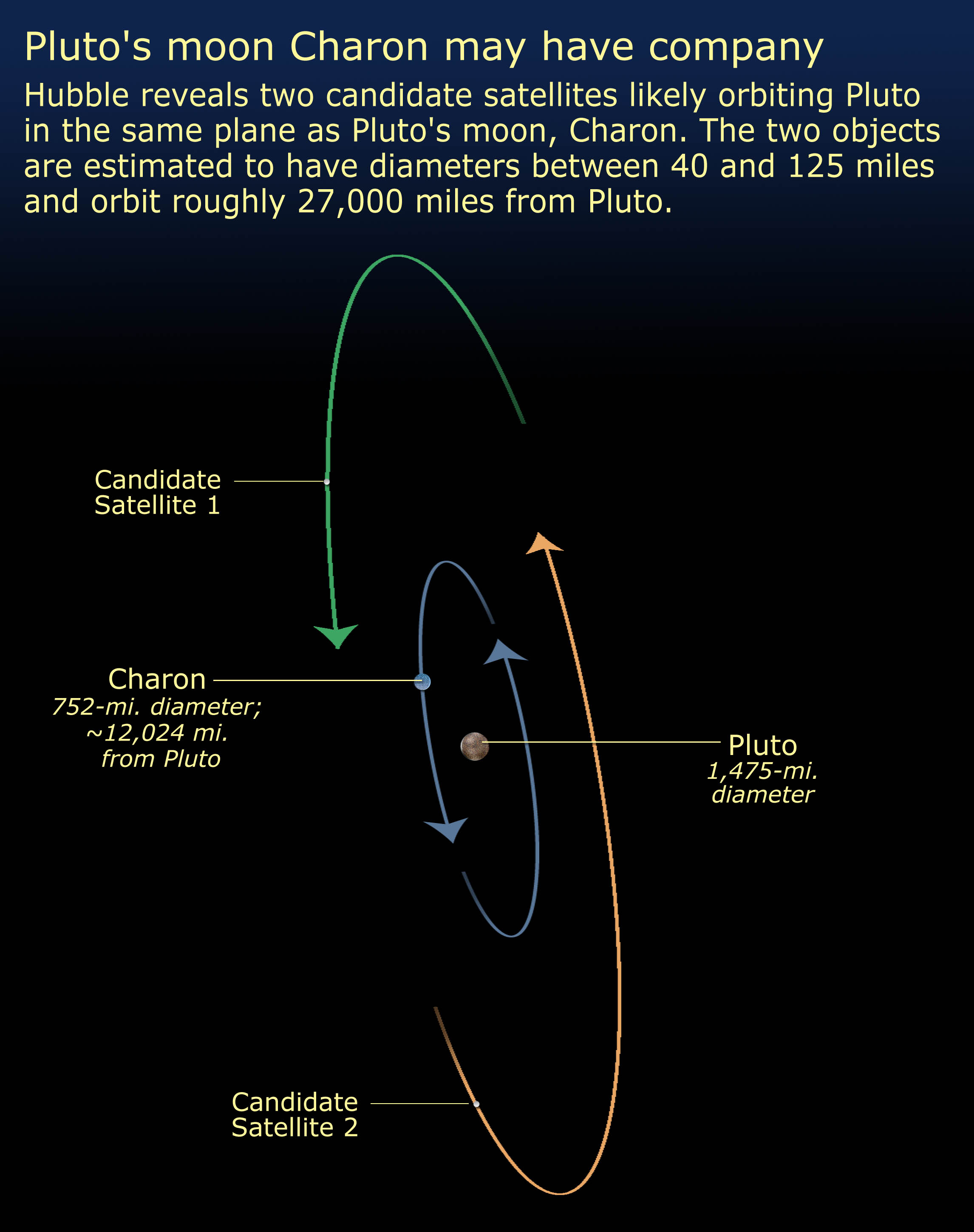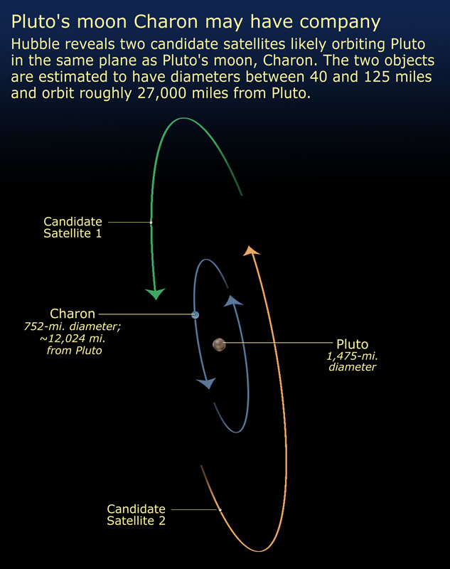 Hubble reveals two previously undetected satellites likely orbiting Pluto in the same plane as Pluto's moon, Charon. The two objects are estimated to have diameters between 40 and 125 miles (64 and 200 kilometers) and orbit roughly 27,000 miles (43,000 kilometers) from Pluto. |