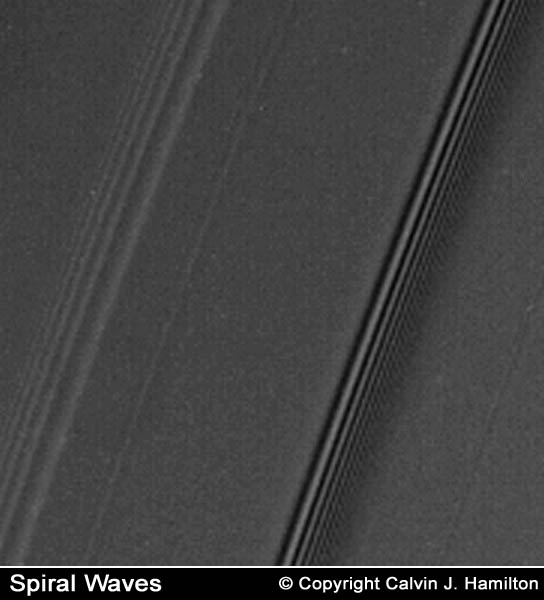Many of Saturn's ring structures appear to be the results of resonance with outer satellites. One prominent structure within the A-Ring is a 5:3 resonance with Saturn's moon Mimas. At this resonance, ring materials circle Saturn 5 times while Mimas orbits 3 times. This Voyager 2, close encounter image of Saturn's A-Ring, shows two wave patterns formed from the Mimas resonance perturbations. On the left is an outward propagating spiral density wave formed by particles that are bunched together in a spiral pattern. On the right is an inward propagating spiral bending wave that is made up of vertical oscillations of the ring material. The distance between these two waves is about 400 kilometers. Another image of these spiral waves can be found at aring3.htm. |