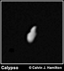 Telesto [tah-LESS-toh] and Calypso [ka-LIP-so] are called the Tethys Trojans because they circle Saturn in the same orbit as Tethys, about 60 degrees ahead of and behind that body. Telesto is the leading Trojan and Calypso is the trailing Trojan. Both were found in 1981 by B. Smith through ground-based observations made in 1980. Telesto is 34 by 28 by 26 kilometers (21 by 17 by 16 miles) and Calypso is 34 by 22 by 22 kilometers (21 by 14 by 14 miles). This image is Copyright © 1997-1999 by Calvin J. Hamilton. Any commercial/for-profit use of this image needs to be addressed to Calvin J. Hamilton. |