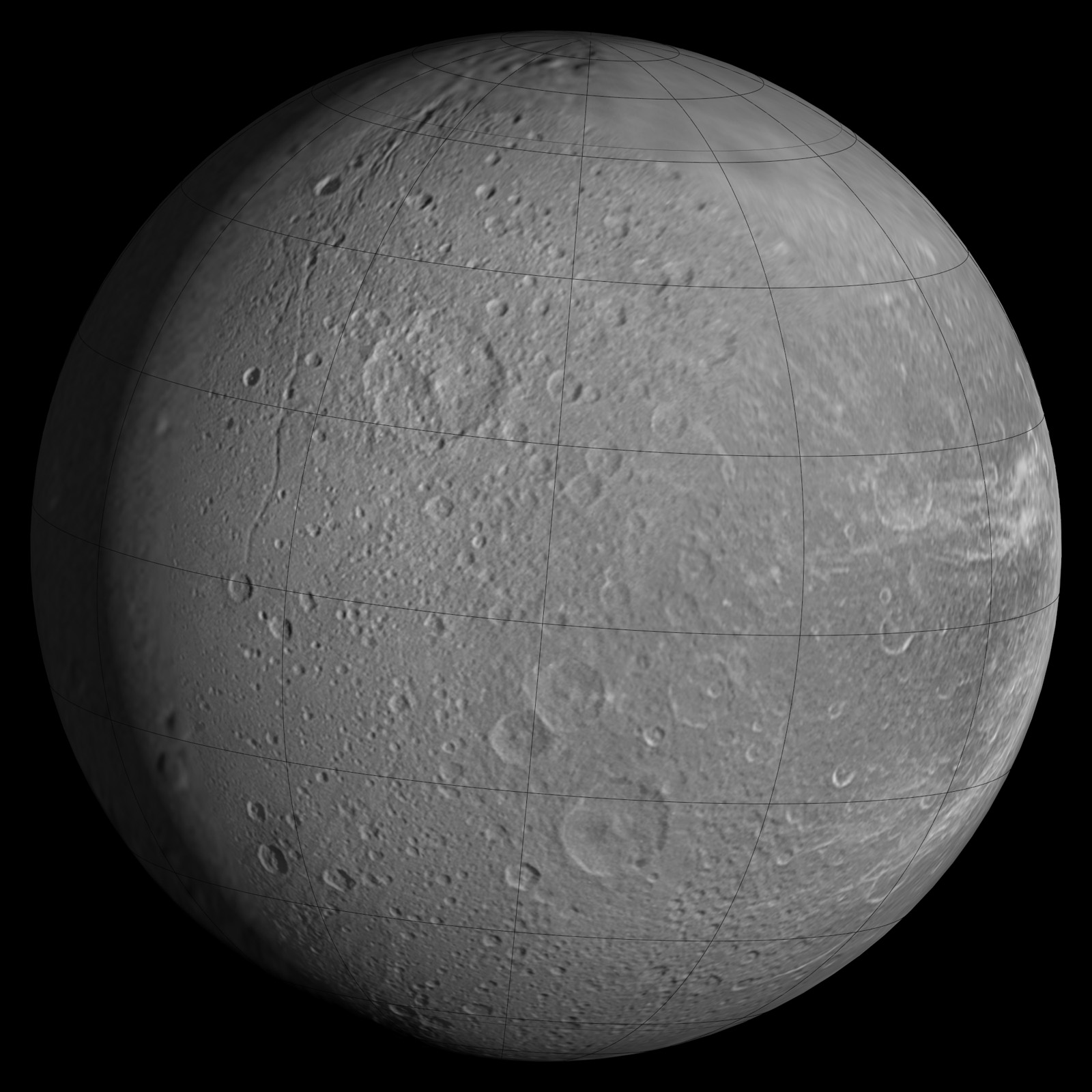 This image was created by projecting a digital map of Dione onto an orthographic view. It includes Longitude and latitude lines to give it a strong 3D feel. (Courtesy A.Tayfun Oner) |