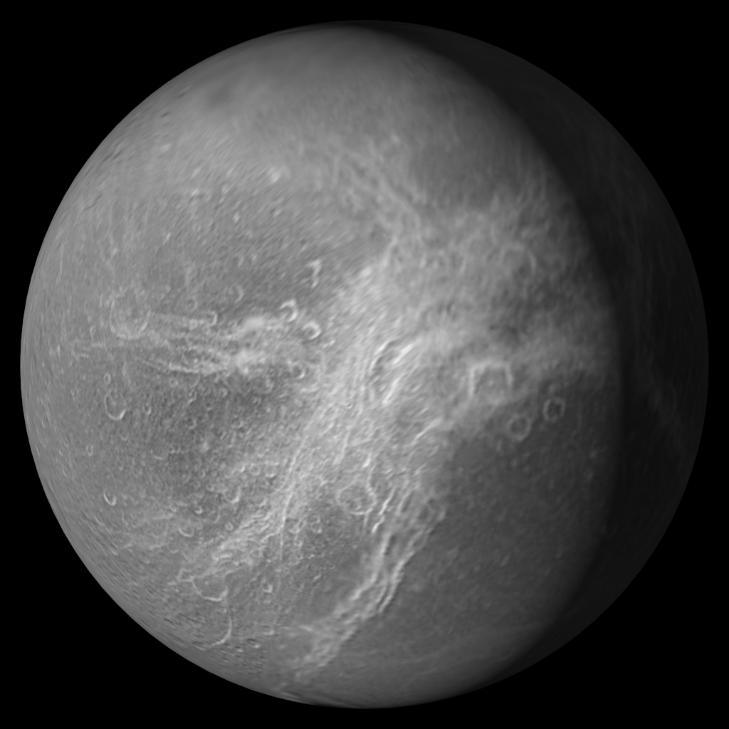 One of the most striking features of Dione is the bright wispy terrain on the trailing hemisphere. Most of these wisps are radial to the large crater Amata but they are curvilinear and do not resemble crater rays. Some of them are associated with topographic features and this suggests that they are surface deposits of ice outgassed from a global tectonic system of fractures. |