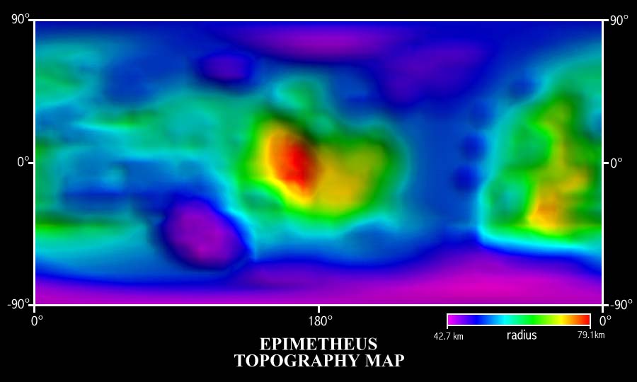 This is a topographic map of Epimetheus. It is based upon the shape model by Phil Stooke. As with all maps, it is the cartographer's interpretation; not all features are necessarily certain given the limited data available. This interpretation stretches the data as far as possible. This image is Copyright © by A. Tayfun Oner. Any commercial/for-profit use of this image needs to be addressed to Calvin J. Hamilton. |