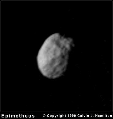 This image of Epimetheus was acquired by the Voyager 2 spacecraft on August 26, 1981. Although the resolution is limited in this view, yet numerous craters are visible.