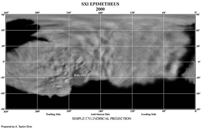 This image is a Simple Cylindrical map of Epimetheus centered at 180 degrees longitude. It was constructed from Voyager 1 and Voyager 2 pictures of Epimetheus using a shape model of Peter Thomas. |