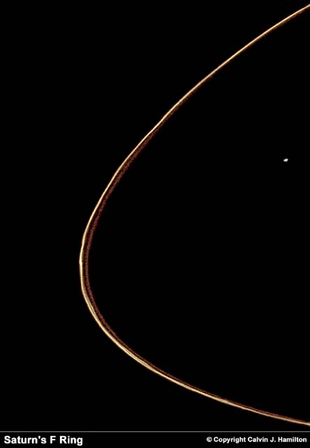 Saturn's outermost ring, the F-ring, is a complex structure made up of two narrow, braided, bright rings along which "knots" are visible. Scientists speculate that the knots may be clumps of ring material, or mini moons. Prometheus, Saturn's inner shephard satellite of the F-ring is also visible off to the right of the image. The F-ring was photographed at a range of 750,000 kilometers (470,000 miles). |