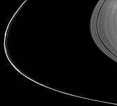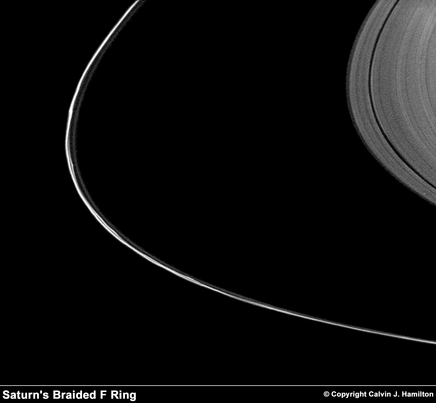 Saturn's outermost ring, the F-ring, is a complex structure made up of two narrow, braided, bright rings along which "knots" are visible. Scientists speculate that the knots may be clumps of ring material, or mini moons. The F-ring was photographed at a range of 750,000 kilometers (470,000 miles). |