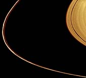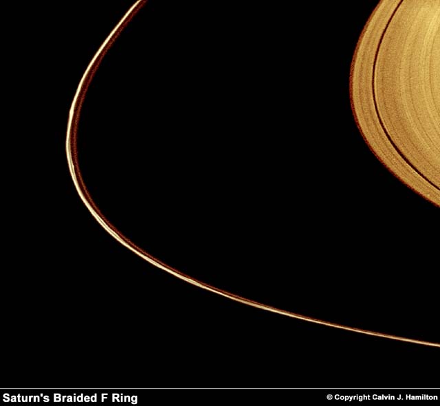 Saturn's outermost ring, the F-ring, is a complex structure made up of two narrow, braided, bright rings along which "knots" are visible. Scientists speculate that the knots may be clumps of ring material, or mini moons. The F-ring was photographed at a range of 750,000 kilometers (470,000 miles). |