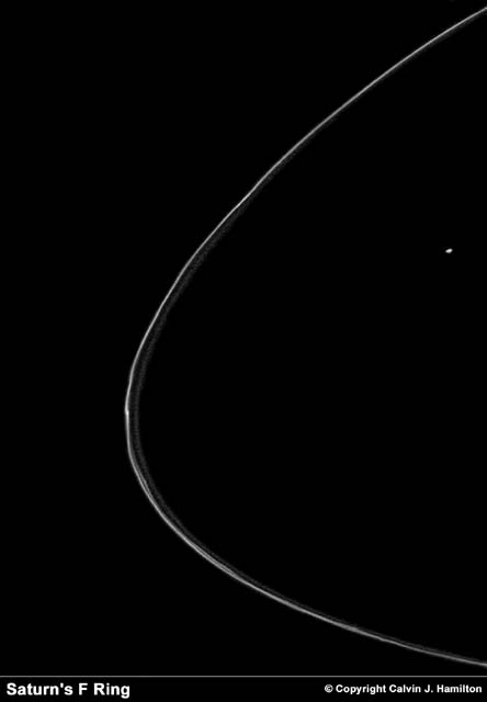 Saturn's outermost ring, the F-ring, is a complex structure made up of two narrow, braided, bright rings along which "knots" are visible. Scientists speculate that the knots may be clumps of ring material, or mini moons. Prometheus, Saturn's inner shephard satellite of the F-ring is also visible off to the right of the image. The F-ring was photographed at a range of 750,000 kilometers (470,000 miles). |