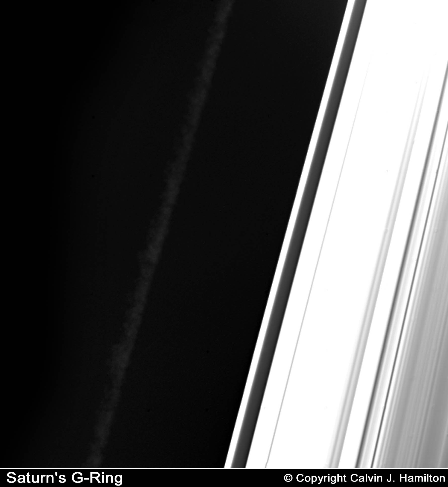 Saturn's G ring was discovered by Voyager 1 in November 1980 and imaged again by Voyger 2 on August 26, 1981 from a range of about 175,000 kilometers. The 8000 kilometer wide G-ring is extreamly tenuous and difficult to see. It is more neutral in color than the E-ring. In this image the A-ring on the right hand side has been washed out due to the long exposure required to bring out the G-ring. Significant image processing was used to isolate the G-ring from the background noise. This included carefully flattening the image intensity across the image plane with low and high pass filtering applied to the G-ring region. |