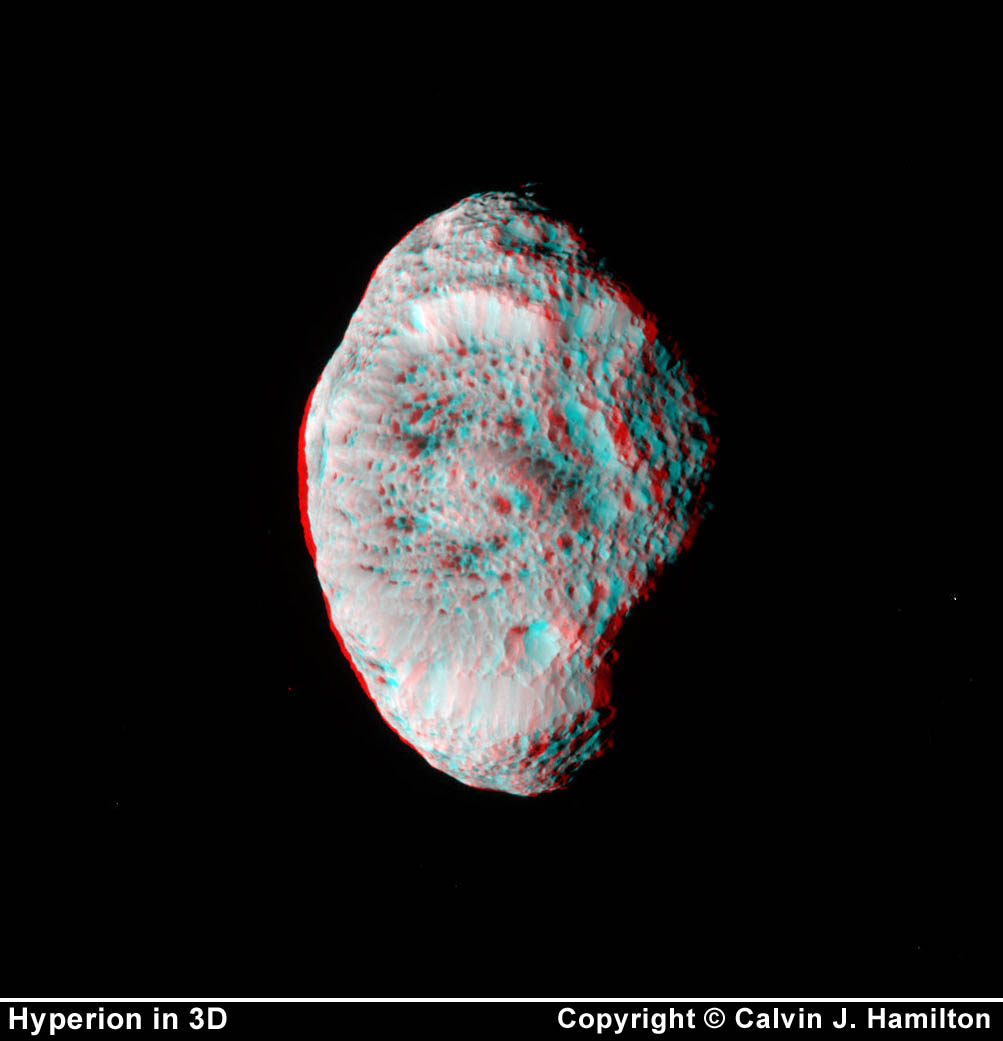This 3D image of Saturn's amazing moon Hyperion was assembled from pictures taken by the Cassini Spacecraft on September 26, 2005. The moon almost has a spongy-looking appearance. |