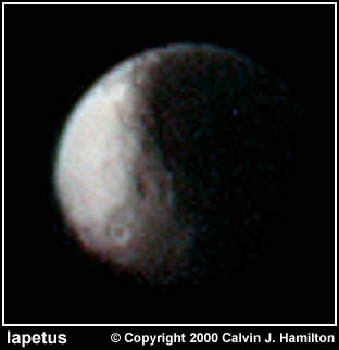 This image of Iapetus was acquired by the Voyager 1 spacecraft on 14 November 1980. The image was created by combining 3 images taken through the orange, green and blue filters of Voyager 1's camera. Voyager 1 did not approach Iapetus as closely as Voyager 2; consequently, the image is of much lower resolution. Despite the low resolution, the image still shows a bright, heavily cratered icy terrain. This image is © Copyright 2000 by Calvin J. Hamilton. Any commercial/for-profit use of this image needs to be addressed to Calvin J. Hamilton. |