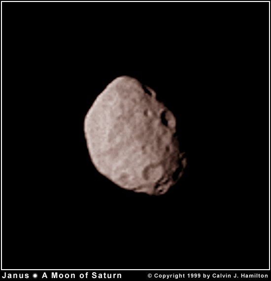 This is a colorized version of the high resolution Voyager 2 spacecraft image of Janus that was taken on August 25, 1981. Janus was discovered by Audouin Dollfus in 1966 and was named after the god of gates and doorways. It is depicted with two faces looking in opposite directions. Janus has an irregular shape with a size of 196x192x150 kilometers (122x119x93 miles) in diameter. It is heavily cratered with several craters 30 kilometers (19 miles) in diameter. The pervasive cratering indicates that its surface must be several billion years old. Janus and Epimetheus share the same orbit of 151,472 kilometers (94,125 miles) from Saturn's center or 91,000 kilometers (56,547 miles) above the cloud tops. They are only separated by about 50 kilometers (31 miles). As these two satellites approach each other they exchange a little momentum and trade orbits; the inner satellite becomes the outer and the outer moves to the inner position. This exchange happens about once every four years. Janus and Epimetheus may have formed from a disruption of a single parent to form co-orbital satellites. If this is the case, the disruption must have happened early in the history of the satellite system. This image is © Copyright 1999 by Calvin J. Hamilton. Any commercial/for-profit use of this image needs to be addressed to Calvin J. Hamilton. |