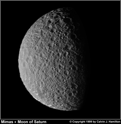 This image of Mimas was acquired by the Voyager 1 spacecraft on November 13, 1980. It is the highest resolution image of Mimas acquired by the Voyager spacecrafts. Traces of fracture marks, probably due to the Herschel Impact, can be seen on this side of Mimas. This image is Copyright © by Calvin J. Hamilton. Any commercial/for-profit use of this image needs to be addressed to Calvin J. Hamilton. |