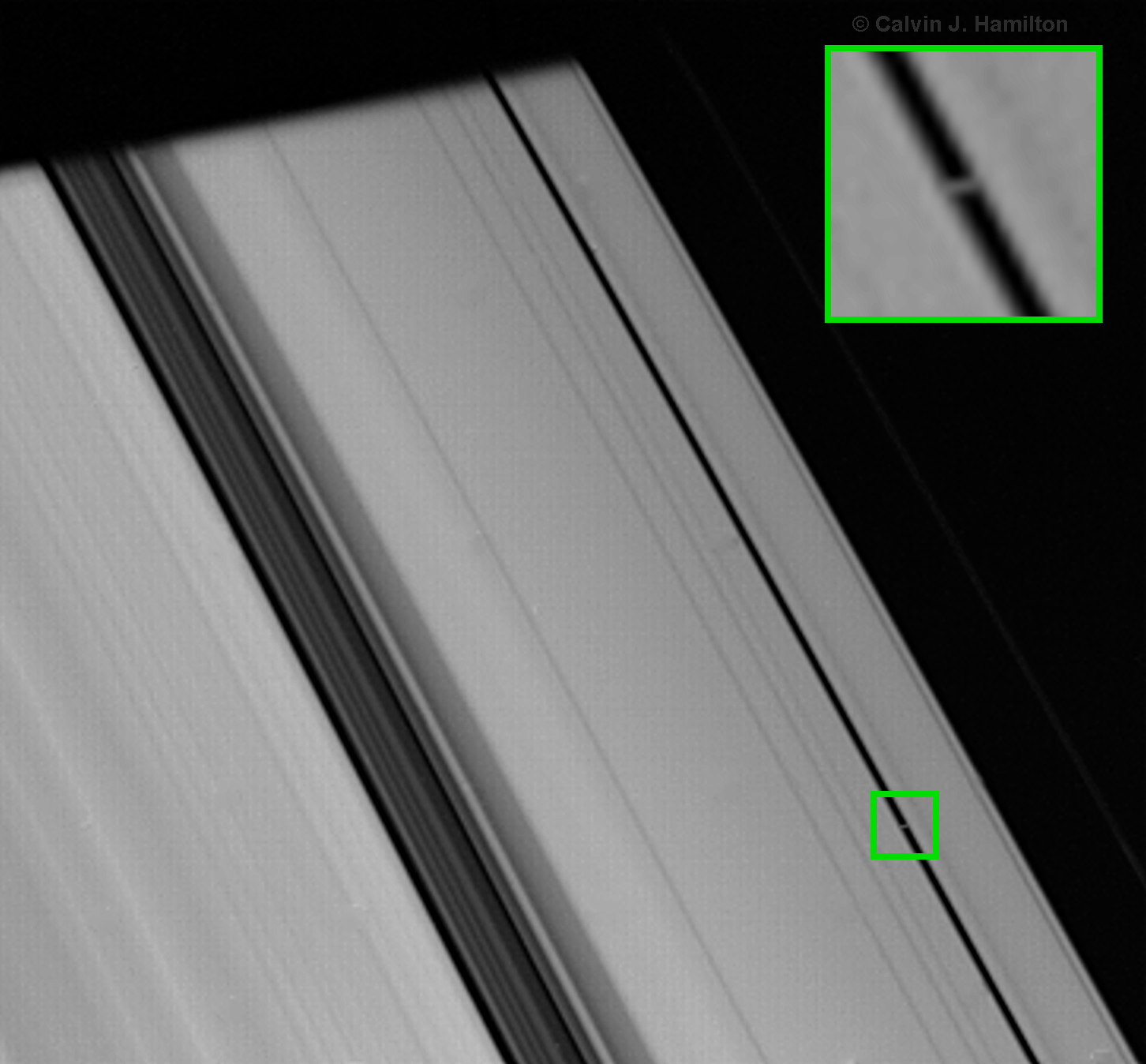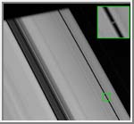 This is the highest resolution image of Pan from the Voyager data. This image shows the A ring entering Saturn's shadow. Pan is located in the center of the small box within the Encke gap. Pan is shown enlarged and enhanced in the inset box. This image is Copyright © 1998 by Calvin J. Hamilton. Any commercial/for-profit use of this image needs to be addressed to Calvin J. Hamilton. |