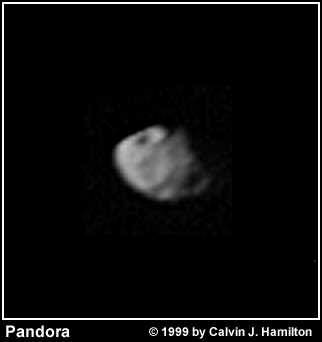 This image of Pandora was acquired by the Voyager 2 spacecraft on August 25, 1981. Pandora is the fourth of Saturn's known satellites. It was discovered from photographs taken by Voyager during its encounter with Saturn by S. Collins and others. Pandora is the outer shepherd satellite for Saturn's F-ring. It has a diameter of about 114 by 84 by 62 kilometers (71 by 52 by 38 miles) and appears to be very heavily cratered. The two largest craters are about 30 kilometers (19 miles) in diameter. No linear valleys or ridges are visible. Very limited data is available to analyze Pandora. This image is Copyright © 1997-1999 by Calvin J. Hamilton. Any commercial/for-profit use of this image needs to be addressed to Calvin J. Hamilton. |