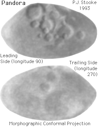 This image is a shaded relief map of Pandora, the outer F Ring Shepherd satellite of Saturn. As with all maps, it is the cartographer's interpretation and not all features are necessarily certain given the limited data available - this interpretation stretches the data as far as is feasible. The original map was published in its full form with latitude-longitude grid, in: Stooke, P.J., 1993. "The Shapes and Surface Features of Prometheus and Pandora", EARTH, MOON AND PLANETS, V. 62, pp. 199-221. Positions in the map are controlled by a digital shape model, described in that paper. For this map, the three dimensional convex hull of the shape model was projected into the Morphographic Conformal Projection (the conventional Stereographic Projection modified for non-spherical worlds). The leading side (longitude 90 runs vertically down the centre) faces forwards in the orbit of Pandora. The trailing side (longitude 270 runs vertically down its centre) faces backwards along the orbit. Longitude 0 is at the righthand end of the leading side, and faces Saturn. As with all conformal (true shape) projections, the scale in these maps varies, increasing from the centre to the outer edge. The map projection is described in: Stooke, P.J. and Keller, C.P., 1990. "Map Projections for Non-Spherical Worlds / the Variable-Radius Map Projections", CARTOGRAPHICA, V. 27, No. 2, pp. 82-100. This version of the file, with labels intact, is in the public domain. Philip Stooke, Department of Geography, University of Western Ontario, London, Ontario, Canada N6A 5C2 stooke@sscl.uwo.ca |
