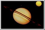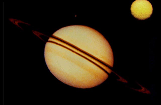 This montage of Saturn and Titan was assembled from Pioneer 11 spacecraft images taken in September 1979. Titan is located at the top-right. |