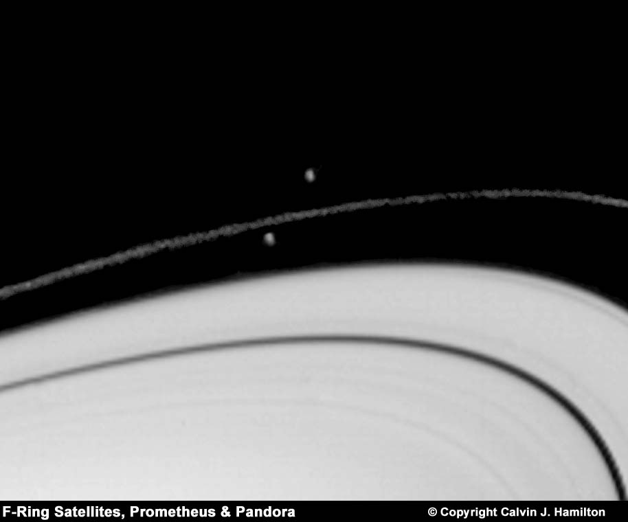 This image shows Saturn's thin F-Ring with shepherd satellites Prometheus and Pandora. Prometheus is the inner moon and Pandora the outer. This is zoomed in section from the image fring5.htm. |