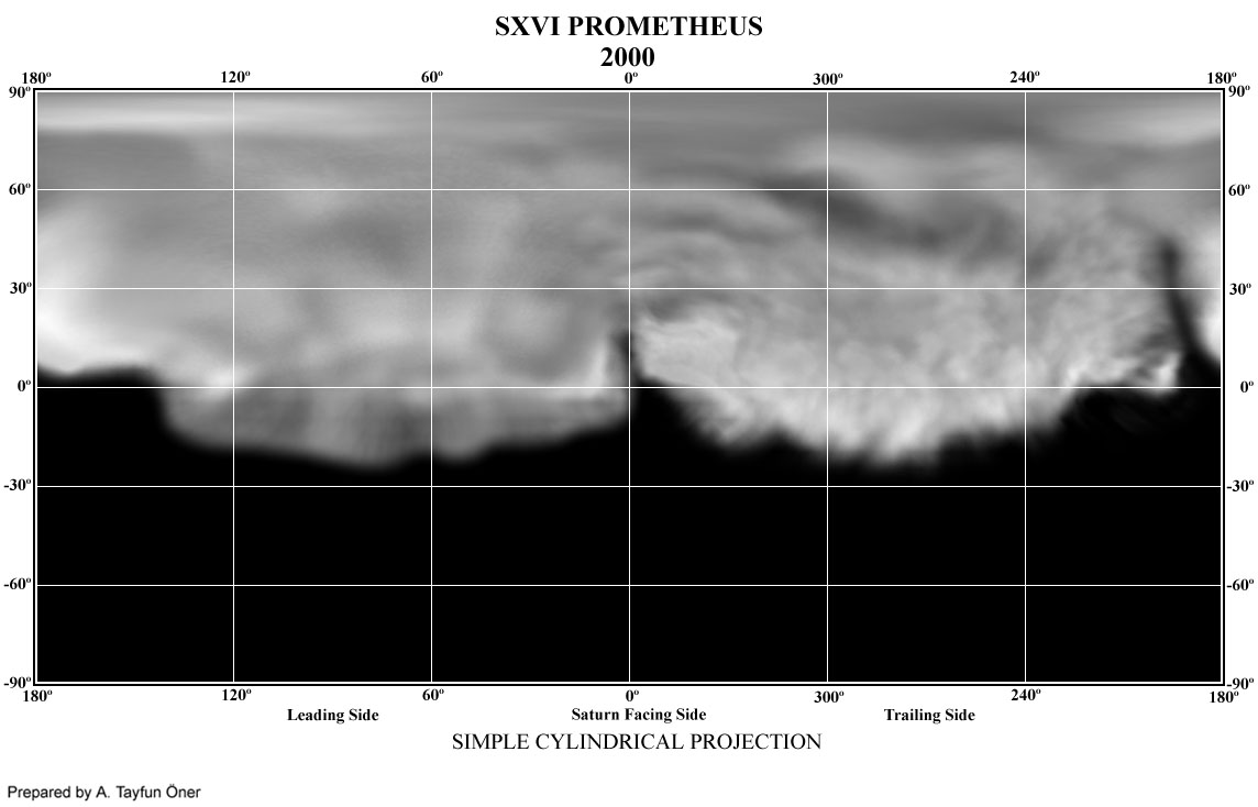 This map of Prometheus was created from Voyager 2 images of the satellite, and the shape model of Phil Stooke. The map is centered at 0 degrees longitude on the side facing Saturn. |