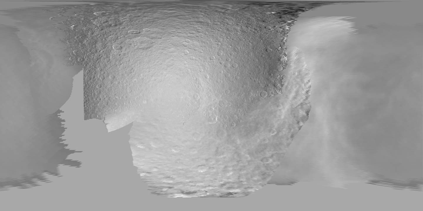 This cylindrical map of Rhea was produced by the USGS from Voyager spacecraft image data. |
