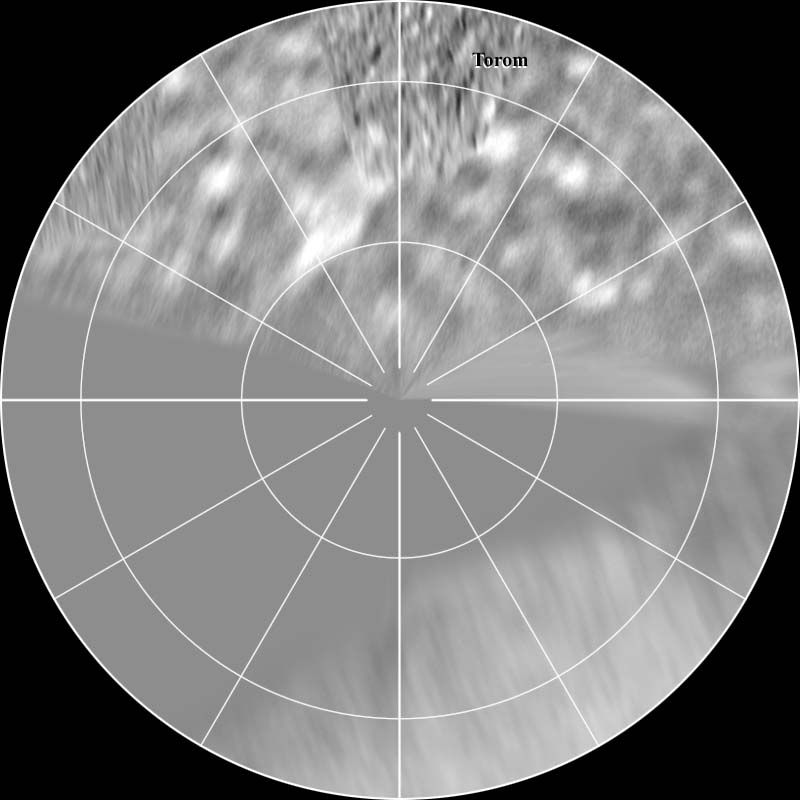 This map of Rhea is in a Polar Stereographic Projection and covers latitudes -65 to -90 degrees. |