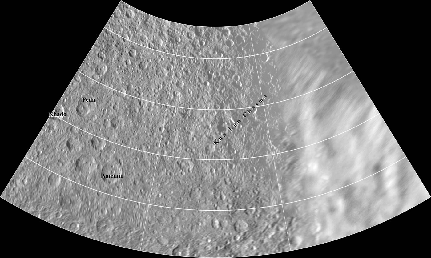 This map of Rhea is in Lambert Conformal Conic Projection and covers longitudes 360 to 270 degrees and latitudes 66 to 21 degrees. |