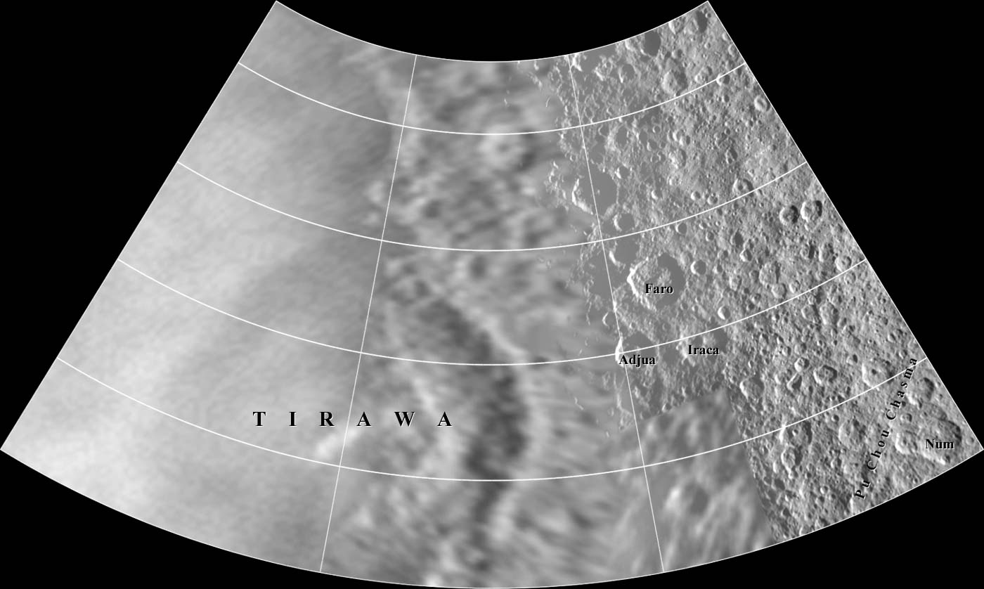 This map of Rhea is in Lambert Conformal Conic Projection and covers longitudes 180 to 90 degrees and latitudes 66 to 21 degrees. |