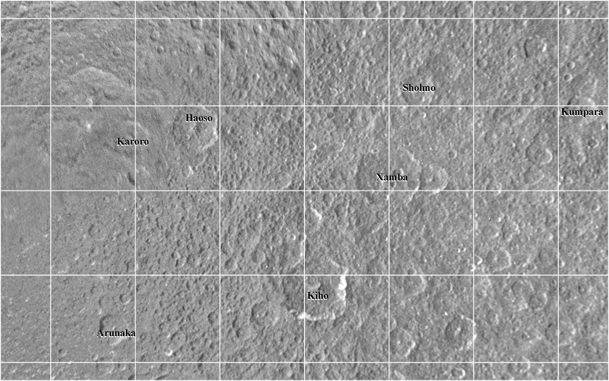 This map of Rhea is in Mercator Projection and covers longitudes 36 to 324 degrees and latitudes 22 to -22 degrees. |