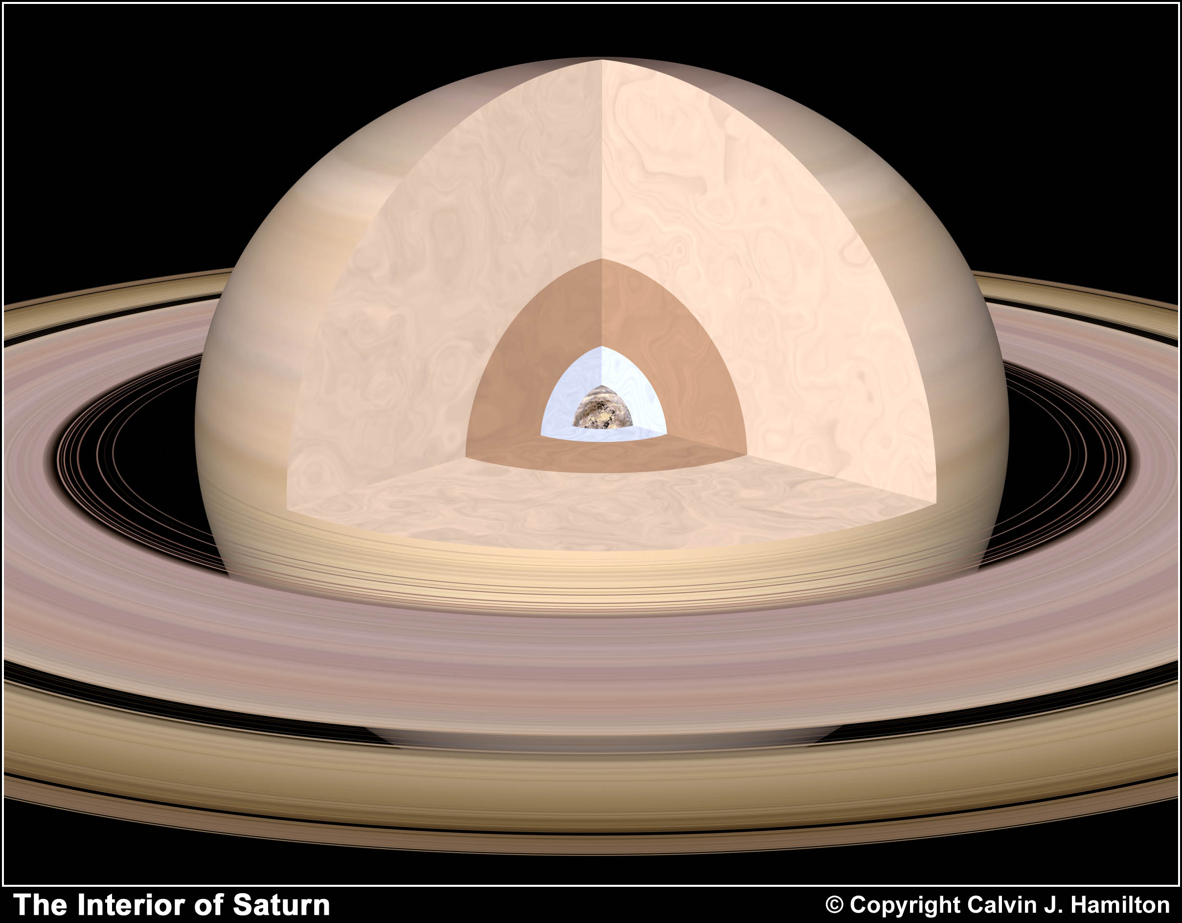 This picture illustrates the internal structure of Saturn. The outer layer is primarily composed of molecular hydrogen. As we go deeper where the presure reaches 100,000 bars, the gas starts to resemble a hot liquid. When the hydrogen reaches a pressure of 1,000,000 bar, hydrogen changes into a new state of metallic hydrogen. In this state it resembles a molten metal. This metalic hydrogen state occurs at about half of Saturn's radius. Below this is a layer dominated by ice where "ice" denotes a soupy liquid mixture of water, methane, and ammonia under high temperatures and pressures. Finally at the center is a rocky or rocky-ice core. |