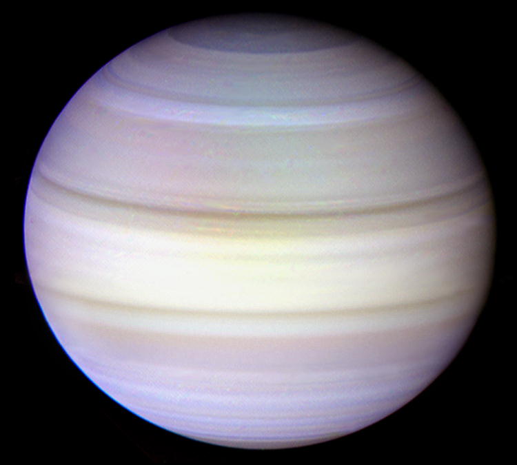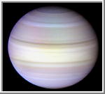 This Voyager 2 picture of Saturn has had its rings and shadows "cosmetically" removed. Most of the current theories about Saturn's rings say that the rings are probably younger than 100,000,000 years and are not stable. This view is a representation of Saturn as it might have appreared 100 million years ago or how it might appear sometime in the distant future. |