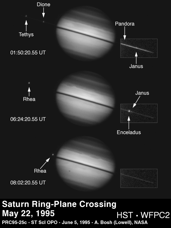 This sequence of images from NASA's Hubble Space Telescope documents a rare astronomical alignment -- Saturn's magnificent ring system turned edge-on. This occurs when the Earth passes through Saturn's ring plane, as it does approximately every 15 years. These pictures were taken with Hubble's Wide Field Planetary Camera 2 on 22 May 1995, when Saturn was at a distance of 919 million miles (1.5 billion kilometers) from Earth. At Saturn, Hubble can see details as small as 450 miles (725 km) across. In each image, the dark band across Saturn is the ring shadow cast by the Sun which is still 2.7 degrees above Saturn's ring plane. The box around the western portion of the rings (to the right of Saturn) in each image indicates the area in which the faint light from the rings has been multiplied through image processing (by a factor of 25) to make the rings more visible. Top - This image was taken while the Earth was above the lit face of the rings. The moons Tethys and Dione are visible to the east (left) of Saturn; Janus is the bright spot near the center of the ring portion in the box, and Pandora is faintly visible just inside the left edge of this box. Saturn's atmosphere shows remarkable detail: multiple banding in both the northern and southern hemispheres, wispy structure at the north edge of the equatorial zone, and a bright area above the ring shadow that is caused by sunlight scattered off the rings onto the atmosphere. There is evidence of a faint polar haze over the north pole of Saturn and a fainter haze over the south. Center - This image was taken close to the time of ring-plane crossing. The rings are 75% fainter than in the top image, though they do not disappear completely because the vertical face of the rings still reflects sunlight when the rings are edge-on. Rhea is visible to the east of Saturn, Enceladus is the bright satellite in the rings to the west, and Janus is the fainter blip to its right. Pandora is just to the left of Enceladus, but is not visible because Enceladus is too bright. An oval-shaped atmospheric feature has just rotated into view (near the eastern limb, at the northern edge of the equatorial zone), and appears to be a local circulation pattern that is not penetrated by the bright clouds that are deflected around it. Bottom - This image was taken approximately 96 minutes (one Hubble orbit) after the center image. The rings are 10% brighter than they were in that image. Rhea is visible just off the eastern limb of Saturn, and casts a shadow on the south face of Saturn. During this exposure, the Earth and Sun were on opposite sides of Saturn's ring plane (they remain in this configuration until 10 August 1995). The atmospheric circulation pattern has rotated to just past the center of the planet's disk, and is followed by more wispy structure in the bright band of clouds, reminiscent of the structure seen during the Saturn storm observed in 1990. These images will be used to determine the time of ring-plane crossing and the thickness of the main rings and to search for as yet undiscovered satellites. Knowledge of the exact time of ring-plane crossing will lead to an improved determination of the rate at which Saturn "wobbles" about its axis (polar precession). Technical Notes - Each of these images is a 7-second exposure at 8922 Angstroms in a methane absorption band. North is up and east is to the left. Credit: Amanda S. Bosh (Lowell Observatory), Andrew S. Rivkin (Univ. of Arizona/LPL), the HST High Speed Photometer Instrument Team (R.C. Bless, PI), and NASA. |