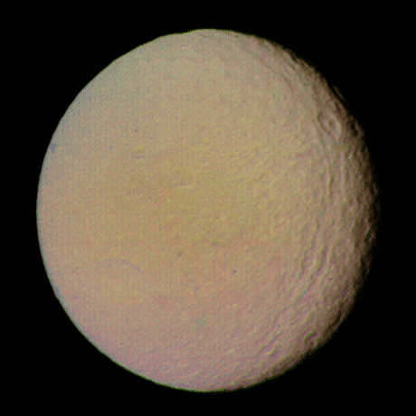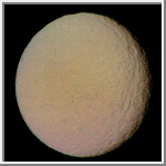 This view of Tethys is a color composite of three images taken by Voyager 2 on August 25, 1981 from a range of 594,000 kilometers (368,000 miles). Tethys' surface is composed of densely cratered regions and a lightly cratered, dark belt that extends across the satellite. Light cratering indicates that the region was once internally active early in Tethys' history and resurfaced part of the older terrain. Ithaca Chasma, an enormous trench that is 65 kilometers (40 miles) wide and several kilometers deep, runs parallel to the terminator at the right. This image is Copyright © by Calvin J. Hamilton. Any commercial/for-profit use of this image needs to be addressed to Calvin J. Hamilton. |