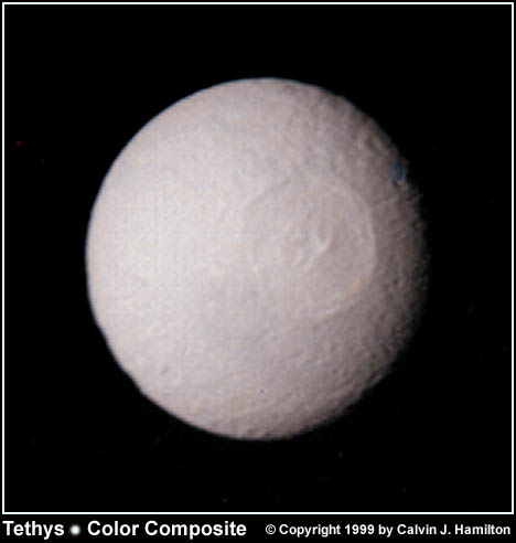 Early in the history of Saturn's moon Tethys, an impact occurred forming an enormous 400-kilometer impact basin named Odysseus. The impact scar spans more than two-fifths of the satellite with a diameter slightly larger than Saturn's moon Mimas. When Odysseus was first created, the crater must have been deep with a high mountainous rim and towering central peak. Over time the crater floor relaxed to the spherical shape of the Tethys' surface, and the crater's rim and central peak collapsed. (Similar relaxation is apparent on Jupiter's moons Callisto and Ganymede.) At the time of the Odysseus impact, Tethys must have been sufficiently warm and malleable to allow the topography to collapse. Tethys' interior may have even been liquid. If Tethys had been colder and more brittle at the time of impact, the moon may have been shattered. If it survived the impact, the topography of the crater would have retained its shape similar to Herschel crater on Mimas. This image was taken by the Voyager 2 spacecraft on August 25, 1981 from a range of 1.1 million kilometers (670,000 miles). |
