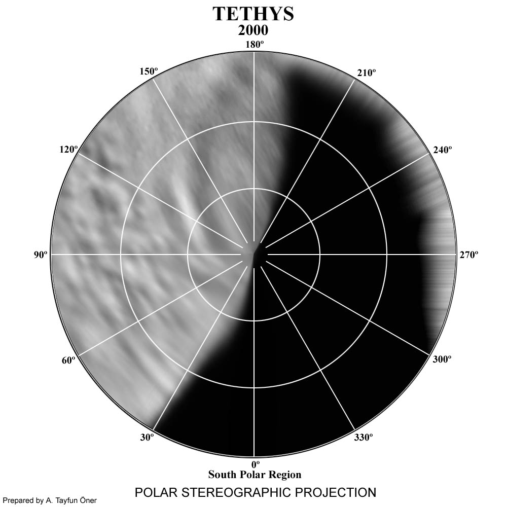 This image is a south polar stereographic projection map of Tethys It covers latitudes -65 to -90 degrees and was made from images taken by the Voyager 2 spacecraft. This image is Copyrighted © 2000 by A. Tayfun Oner. Any commercial/for-profit use of this image needs to be addressed to Calvin J. Hamilton. |