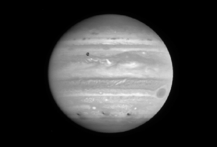 This image of Jupiter was obtained with a filter at 336 nm (near-ultraviolet light) at 18:42 UT on 17 July 1994. Three impact sites (from left to right: C, A, and E) are visible as dark spots across the lower portion of the image. All other features in this picture are characteristic of Jupiter's normal state. The feature created by the impact of A is 23 hours old in this image. The C and E features are 12 and 5 hours old, respectively. Io is seen as a dark spot in the northern hemisphere (on the left) and the red spot is visible on the right limb. |