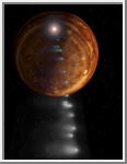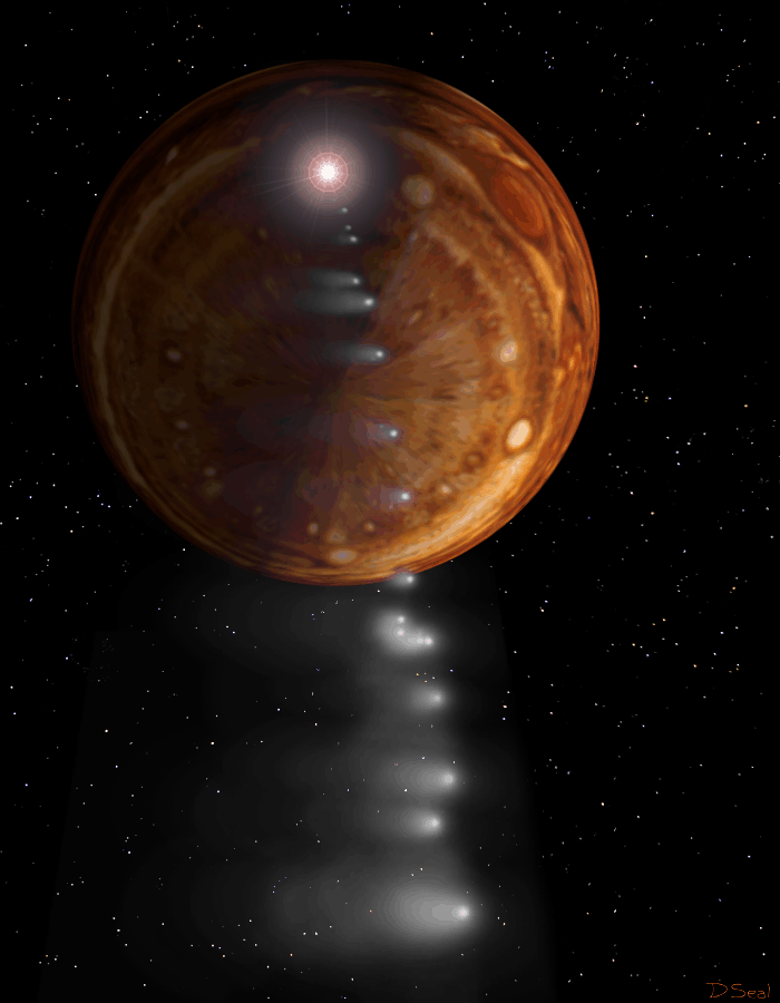 This depiction of comet Shoemaker-Levy 9 impacting Jupiter is shown from the viewpoint of Jupiter's south pole. For visual appeal, most of the large cometary fragments are shown close to one another in this image. At the time of Jupiter impact, the fragments will be separated from one another by several times the distances shown. |