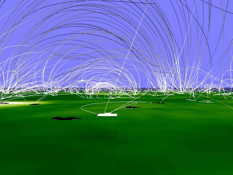 Between pairs of opposite polarity, magnetic field connections exist, represented here by lines based on computer calculations. These horseshoe shaped loops extend above the surface into the corona. Although small relative to the Sun, they range between a few thousand to several tens of thousands of miles in length; the smallest would still fit around the Earth. Each one of these loops carries as much energy as a large hydroelectric plant, such as the Hoover dam, would generate over a million years.