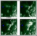 This sequence of 4 images shows the rapid formation and spreading of moss following a minor flare event. The blue circle in each image shows the approximate size of the Earth in the field-of-view. Image times are as follows.