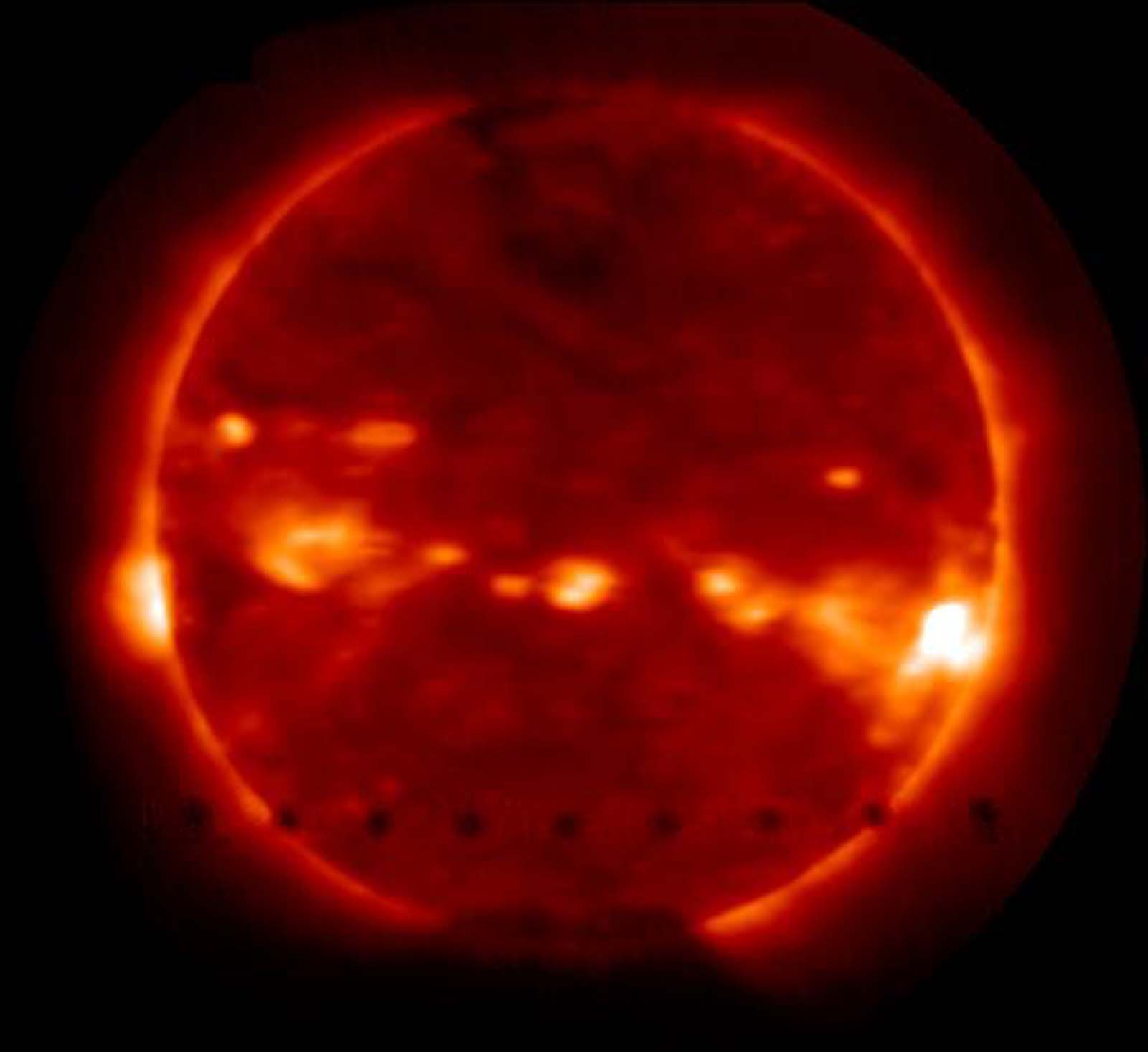 The NOAA Space Environment Center in Boulder, Colo., used the NOAA GOES-12 satellite space weather instrumentation to observe the passage of Venus in front of the sun. This transit of Venus is the first in 122 years. The GOES observation, using its Solar X-ray Imager, is unique because it records the sun’s 2 million degree, outer atmosphere in X-rays. This observation is possible only from space, since Earth’s atmosphere blocks out X-rays. The GOES-12 SXI is the only spacecraft to observe this event from space in X-rays. The image shows the Venus transit as captured by the NOAA Solar X-ray Imager from 12:54 a.m. to 8:44 a.m. EDT. In the NOAA images, Venus appears as a dark disk about 1/30th the sun’s apparent diameter. Since the sun’s atmosphere or corona extends well above the disk seen in visible light, Venus was visible in silhouette for approximately nine hours, versus the six hours seen from Earth. The path across the disk is from the southeast to the southwest. "Historically, transits of Venus were used to determine the absolute scale of the solar system," said Ernest Hildner, director of the NOAA Space Environment Center. "For SXI, the data taken during the transit of Venus will provide benefits to understanding the SXI instrument performance and thus potentially improving space weather forecasts. There may even be a possibility of using the SXI data to study the atmosphere of Venus," he added. The GOES-12 SXI takes a full-disk image of the sun’s atmosphere once every minute. The images are used by NOAA and the U.S. Air Force to monitor and forecast solar flares, coronal mass ejections, coronal holes and active regions. These features are the dominant sources of disturbances in space weather that lead to geomagnetic storms. |